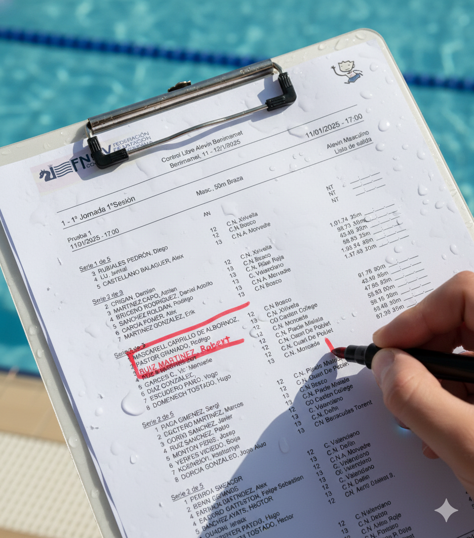 Como nadador del Club Natación Mediterráneo Valencia, conocía perfectamente el problema: perder tiempo subrayando series manualmente en cada competición. Yellow o'clock nace de esa necesidad real, desarrollada por alguien que vive el mundo de la natación competitiva cada día y cuenta con las habilidades técnicas para crear la solución perfecta.